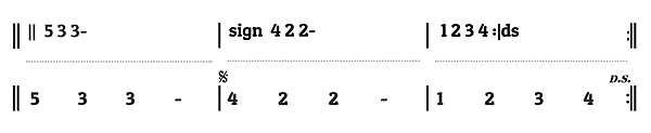 簡語言中 Sengo 記號我們就直接這樣打 sign ,|| 533- sign 422- 1234 :|ds ( 記得 sign音符 之間需要 空格 ),範例如下。。