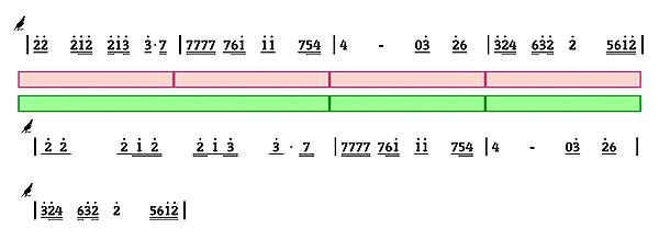 當您想調整小節時,只要從介面上點選您想要的結構就能立刻調整,如下面圖示原本 4 小節 (粉紅色) 點擊綠色結構後變 3 小節 ,剩餘小節會順推到下面一行,方便您 音符或歌詞字數太多特殊結構 時調整。