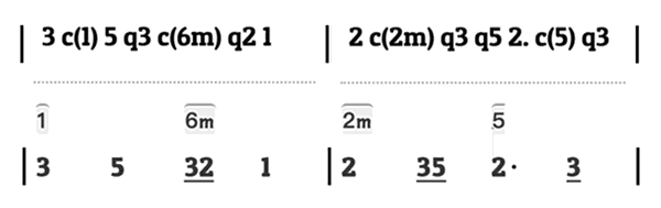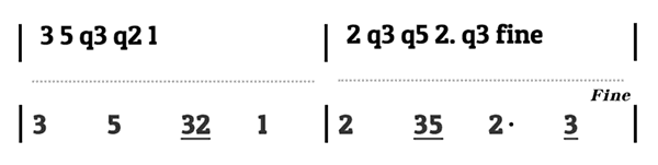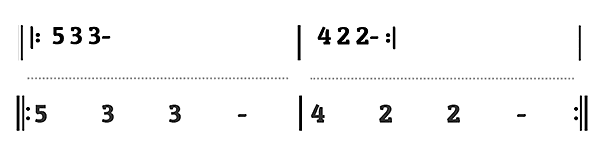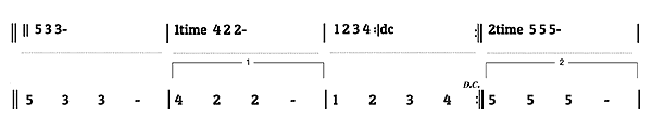 one time , two time 的反覆記號,演奏的順序是 533- 422- 1234 533- 555-,也就是第一次會演奏到 1 的部份,但第二次反覆時,就要跳過 1 直接到 2。