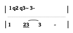 簡語言是在兩個音符之間輸入 " ~ " ,如 1 q2 q3~ 3-。