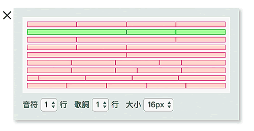 點擊鵝毛筆圖示後便出現調整小節介面,除了可調節 小節樣式 之外還有新增 音符歌詞行數 及此行 歌詞字型大小 ,關閉調整小節介面可按“X”關閉按鈕或點擊介面以外的任一畫面。
