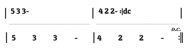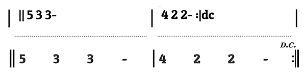 在簡語言中是這樣打 533- 422- :|dc, " dc " 加在 " :| "後面就好了,就會重頭再演奏一次。