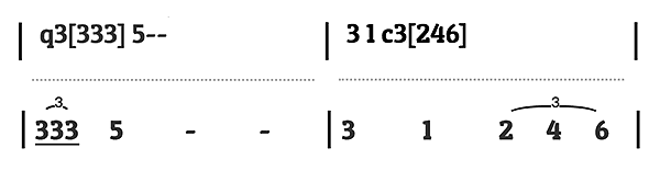 一拍三連音: 簡語言輸入 q3[音符] ,如 q3[333] 5 - -。